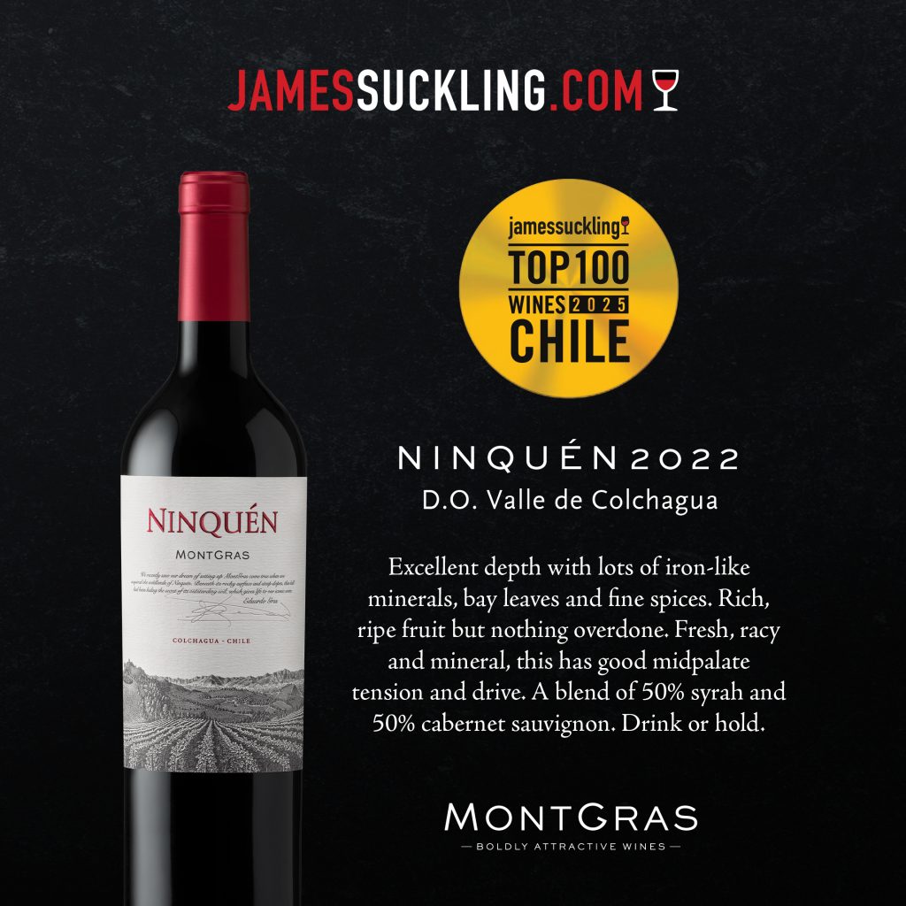 En MontGras recibimos esta noticia con mucha alegría y orgullo: NINQUÉN by MontGras 2022 fue reconocido en el prestigioso ranking “Top 100 Wines from Chile 2025” de James Suckling, una de las voces más influyentes del mundo del vino.